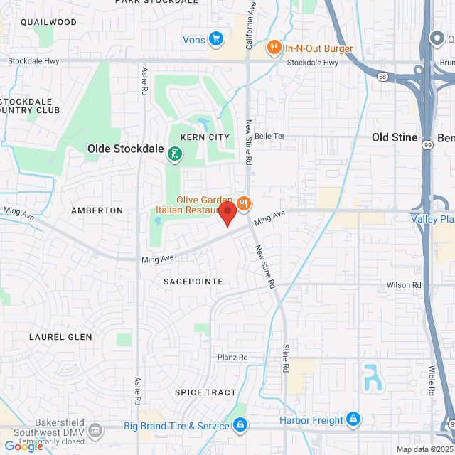 My business address is **5500 Ming Ave., Ste. 366**. The nearest major cross streets are Ming Ave. and New Stine Rd. My office is located in the back of the buildings. Park nnear the mailboxes and the entrance to the building is west of the mailboxes on the first floor.